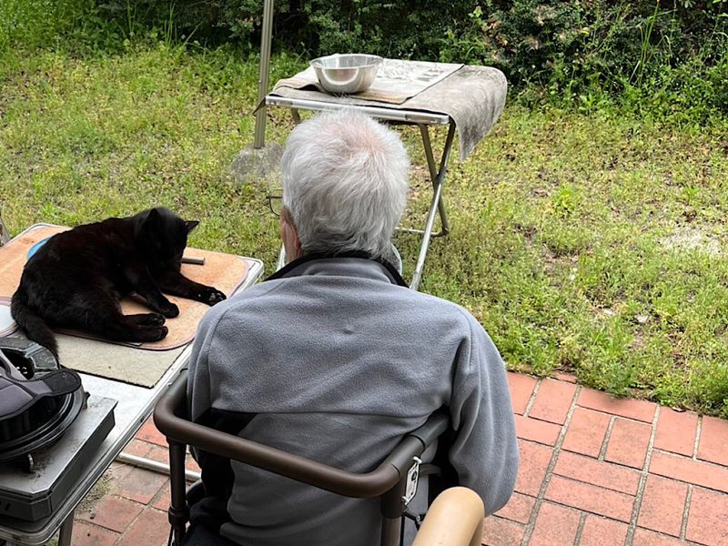 今ではスムーズに更衣する事ができ、今ではこの写真のように飼っている猫ちゃんと一緒にデイサービスの車を待っています。笑