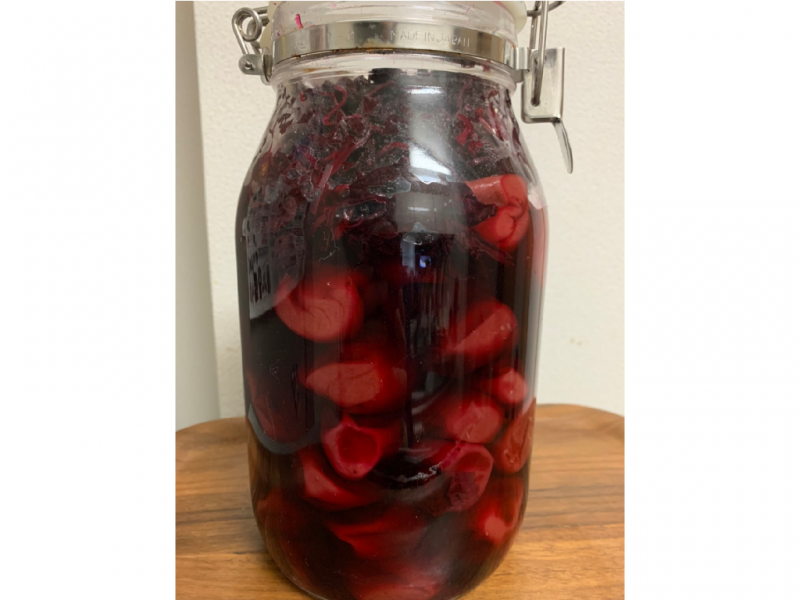 梅酢が上がった保存瓶に赤紫蘇をイン!