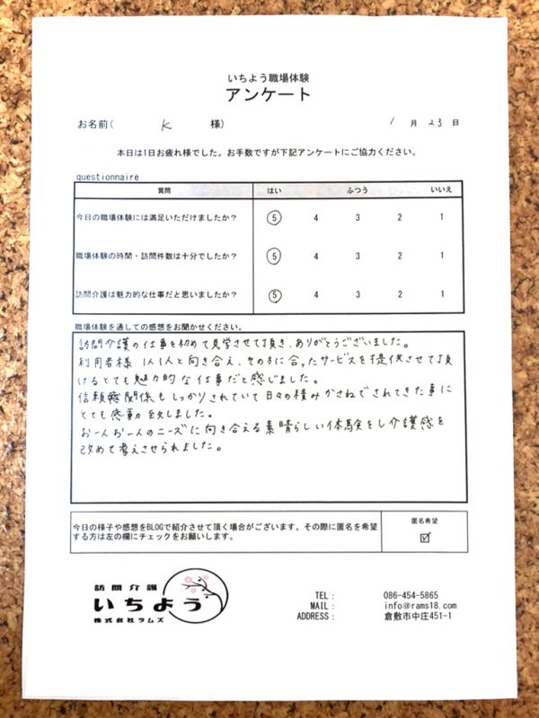 訪問介護の職場体験、倉敷事業所でご利用頂きました!